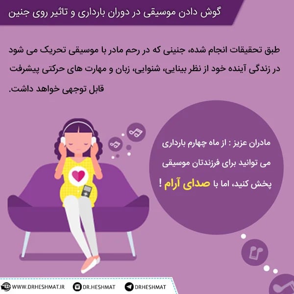 موسیقی دوران بارداری | آیا جنین در شکم مادر صداهای اطراف را به خوبی می شنود؟ این سوال تا سال ها قبل برای همه مادران مطرح بود اما تحقیقات نشان داده است مادرانی که در طول بارداری برای جنین آهنگ یا شعر خاصی را زمزمه می کنند، بعد از تولد به راحتی می توانند با همان زمزمه گریه کودک خود را متوقف کنند! طبق این تحقیقات مادران باردار می توانند از ماه چهارم برای جنین خود موسیقی بگذارند، موسیقی کلاسیک به خصوص موسیقی باخ به دلیل تونالیته ای که دارد از مایع آمنیون دور جنین بهتر رد شده و گوش جنین آسوده تر آن را درک می کند. یادمان باشد موسیقی را باید با صدای آرام برای جنین پخش کرد. موسیقی دوران بارداری و اطلاعات درمورد آن از جمله مواردی است که در مشاوره های قبل از بارداری به زوجین توصیه می گردد.