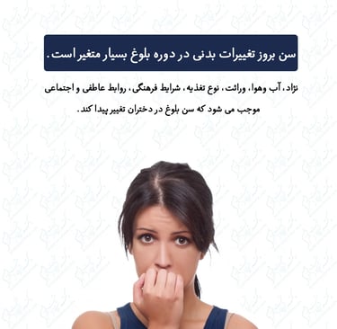 علامت های جسمی بلوغ به دنبال یکسری تغییرات هورمونی بدن که از طریق مغز (سیستم هیپوفیز و هیپوتالاموس) کنترل میشود و ارتباط مستقیمی با تخمدان (در دختران) دارد، ظاهر میشود. سن بروز تغییرات جسمانی در دوره بلوغ ثابت نبوده و بسته به شرایطی که خواهیم گفت متغیر خواهد بود .